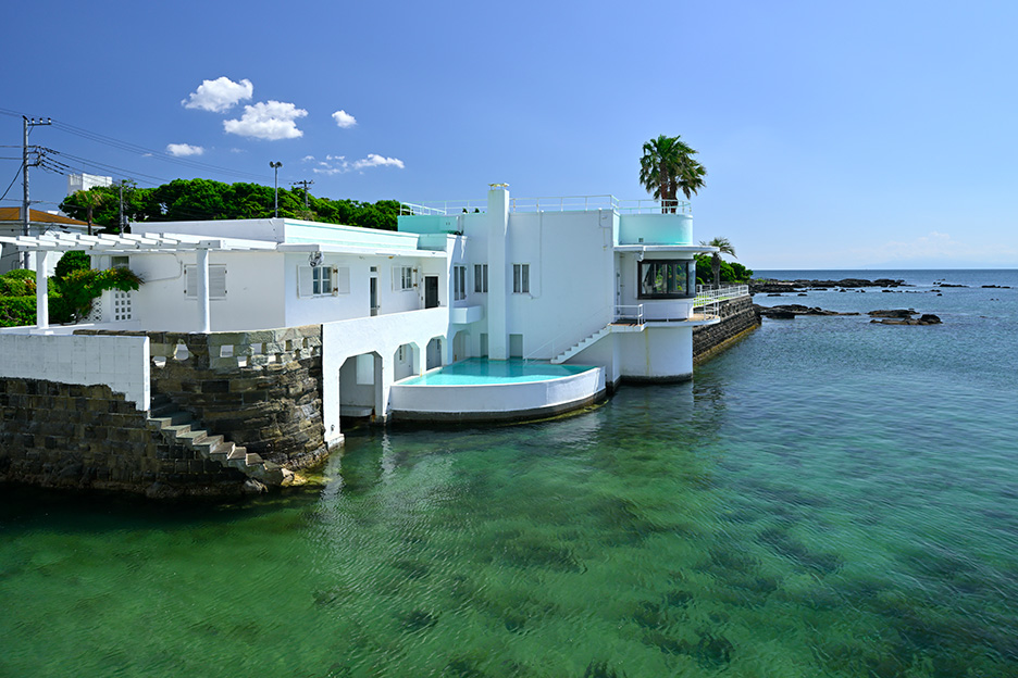 建物は昭和10年(1935)竣工、アールデコやモダニズムといった、西洋建築の流行をクロスオーバーして取り入れる、昭和初期建築の典型的な特徴をとらえた超モダンな設計です。しかも現在の建築法では許されない、海からそのまま船で邸宅内に入れる停泊場を兼ね備えた、日本で唯一の現存するボートハウス…しかし設計者の名前は残されていません。