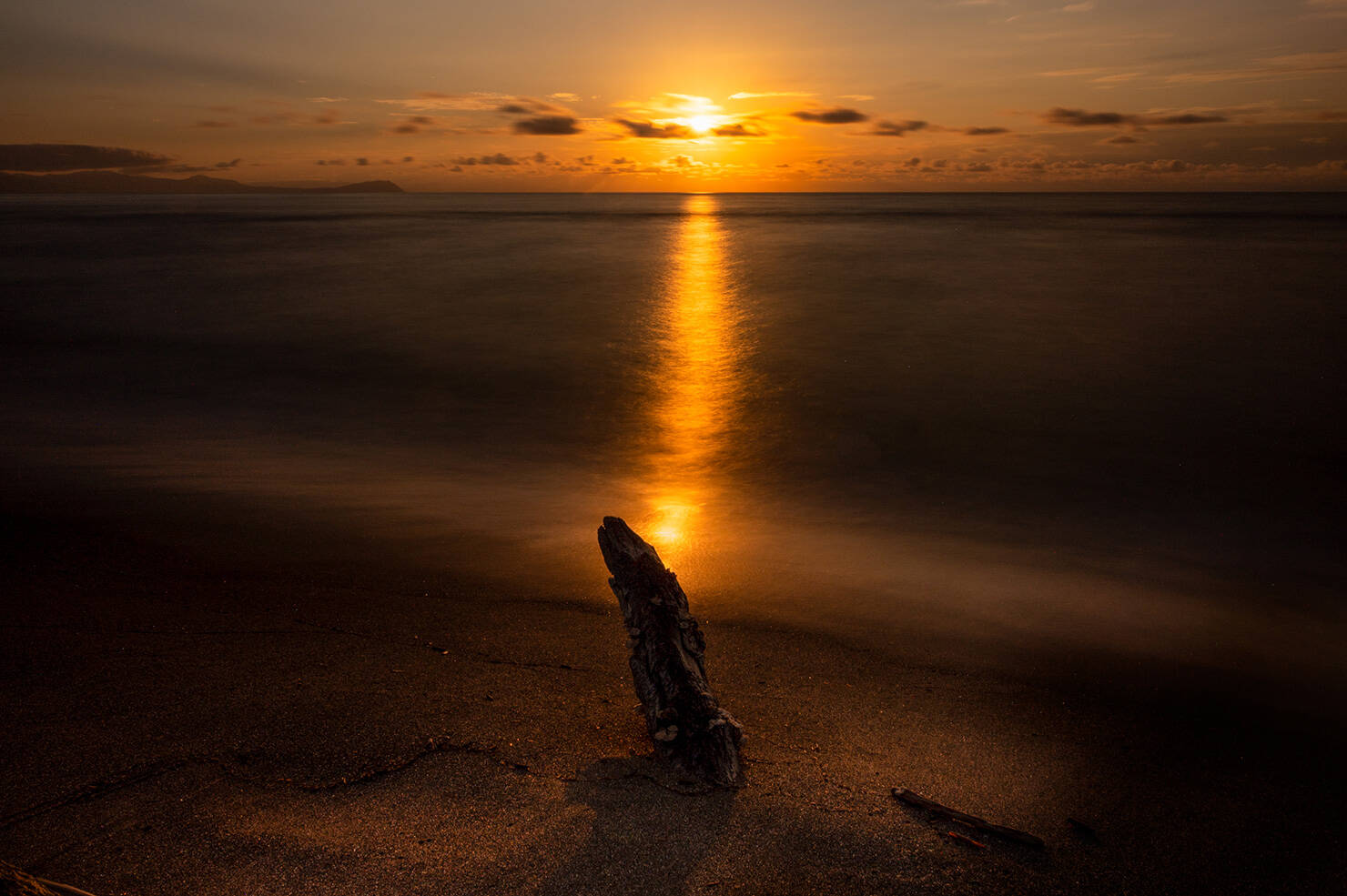「海に沈む夕日というのはよくある表現なのですが、〈流木の祈り〉は、不思議な形をした流木を光の道の延長線上に置くという、シルエットの表現が秀逸。仕上げも絶妙で、浜辺の砂の表情などを含め、夕暮れ、光が最後に失われていく美しい瞬間をありありと実感できる作品になっています」(熊切)
