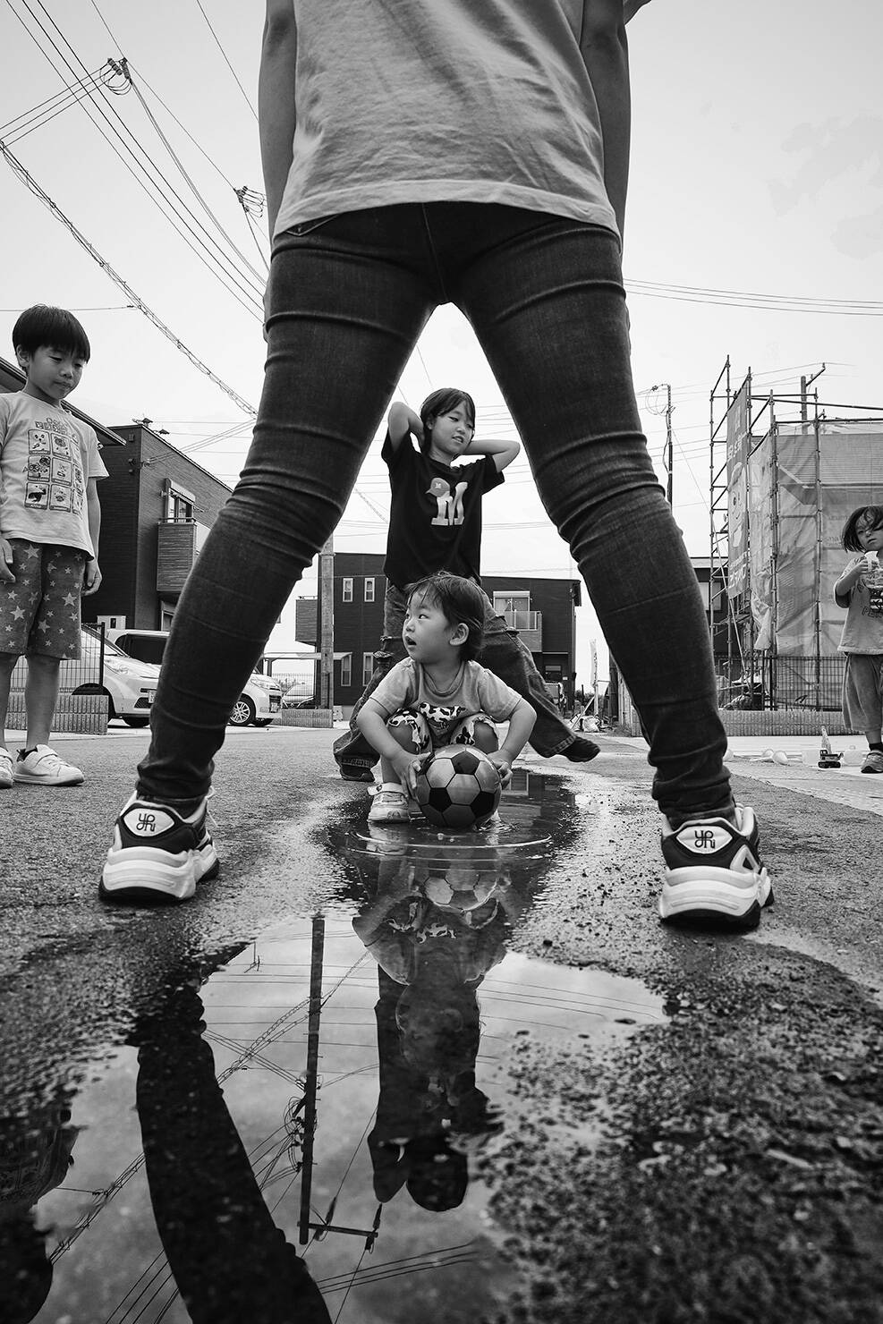 「〈みんなで遊んだ日〉は、子供の表情や仕草が全面に押し出された作品。大人の足の間から覗く、目線を低くした世界は、10代の感覚だから撮れた眩しさがあります。水溜まりに反射する写り込みや、左右に見切れた人物の写し方などの技術面でも安定感があり、モノクロの階調の出し方も自然です」(秋山)