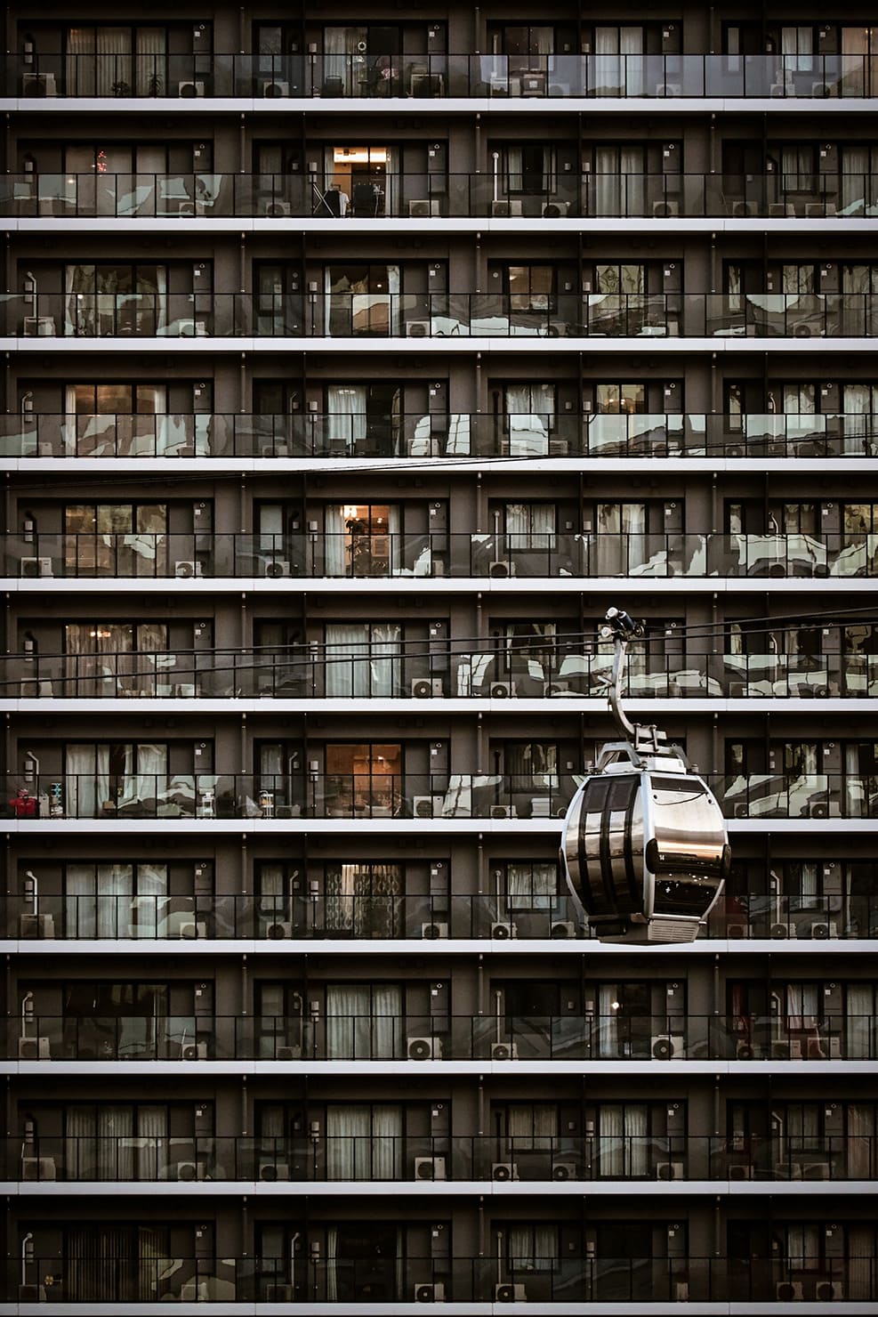 「〈静寂の介入〉は、ゴンドラと建物の組み合わせが近未来的。水平を意識した仕上げによって、デザイン性の高い1枚になっています。ゴンドラが主役になりそうな構図ですが、背景に広がる集合住宅とそこに垣間見える人々の暮らしが見られるのも魅力になっている点でもおもしろいです。生活の気配が想像力を刺激する、情報量豊かな1枚です」(熊切)