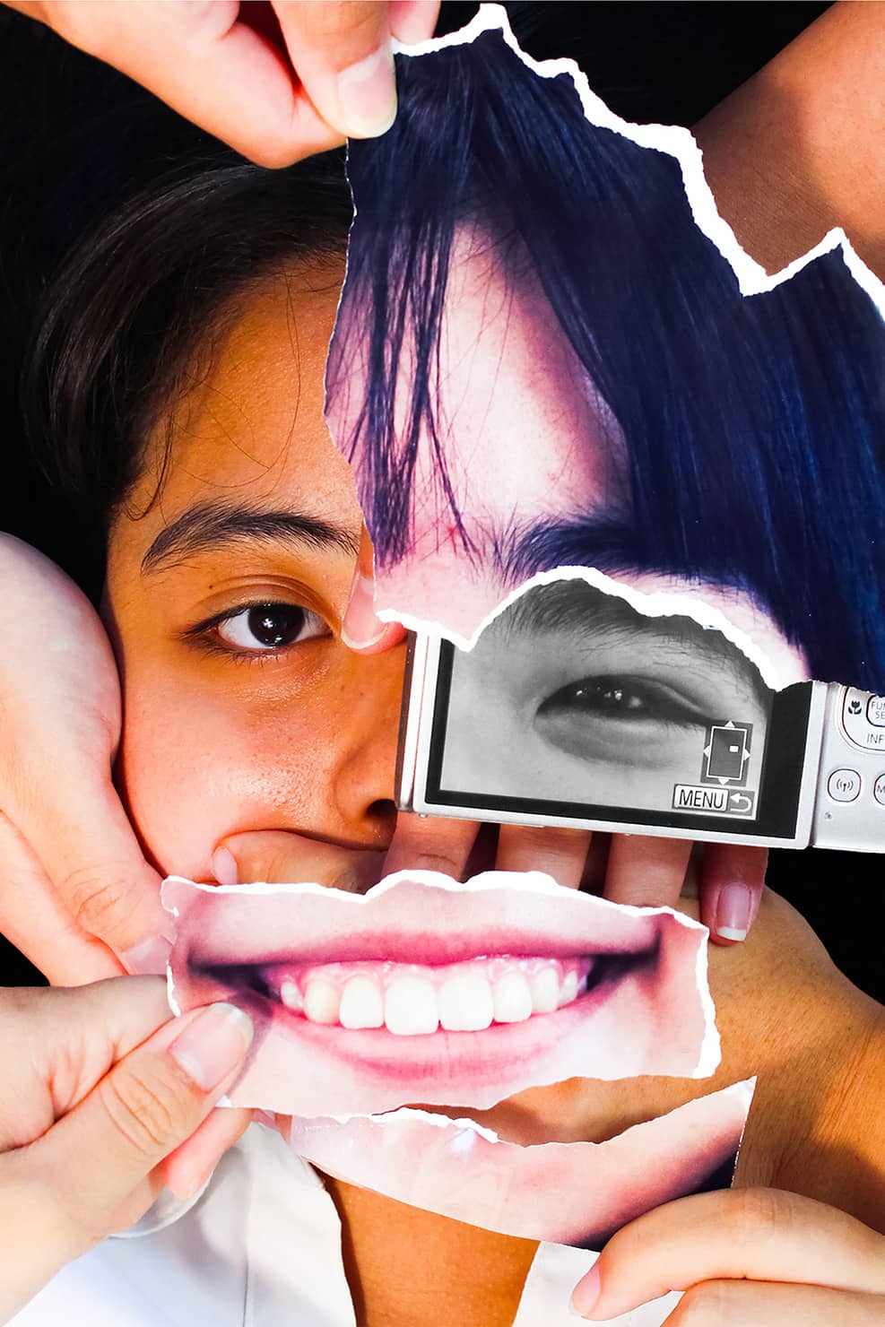 「実在の人物とコラージュされた紙素材の色彩やモノクロ表現の違いを生かし、平面的な写真にレイヤーによる奥行きや立体感を生み出しています。色の差によってふわっと浮かび上がっているような仕上がりが印象的です。人の手によって配置された笑顔のパーツが、内面や他者から見た表情の違いを想像させ、読み取りの深い表現へとつながっています」(秋山)
