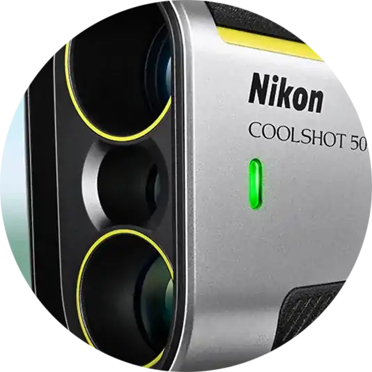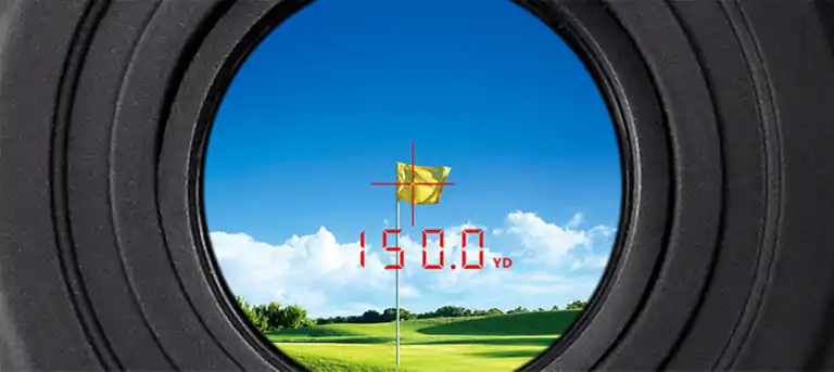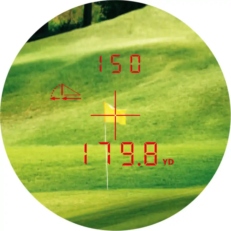 林の手前のピンフラッグまでの距離を測定すると、ファインダー内に赤いサインが点灯し、同時に本体が振動してお知らせします。視覚と振動で、ピンフラッグが測れたことがより分かりやすくなりました。測定した距離が“ピンフラッグ”なのか“奥の林”なのか、もう迷いません。