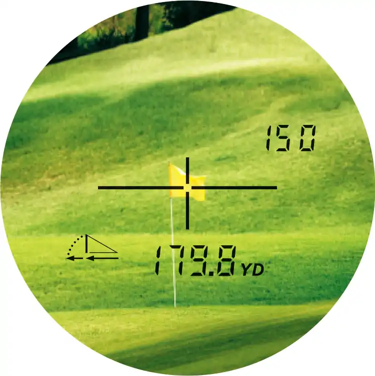 手前のピンフラッグの距離を測定すると、ファインダー内にサークルサインが点灯し、ピンフラッグが測れたことがひと目で分かります。重なりあった目標物の距離を間違えることなく計測できます。