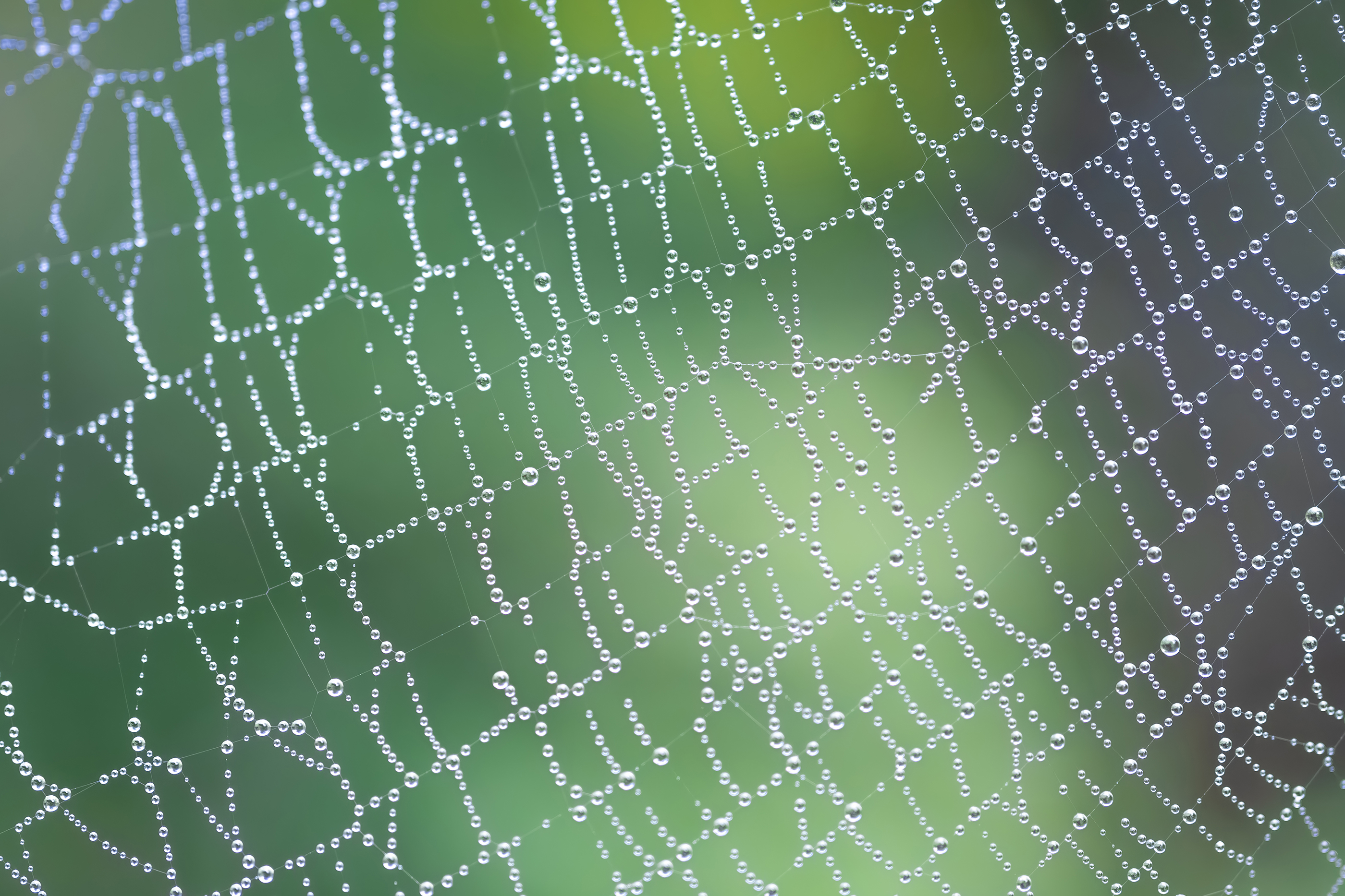ある晴れた日の午前中、森の中で水がしたたるきれいなクモの巣を見つけた。マイクロレンズでのぞくと、ダイヤモンドが連なる豪華なネックレスに見えた。限界まで寄ることでクモの巣がまとう水滴の様子にフォーカスでき、背景の柔らかいボケが見事に際立たせてくれた。