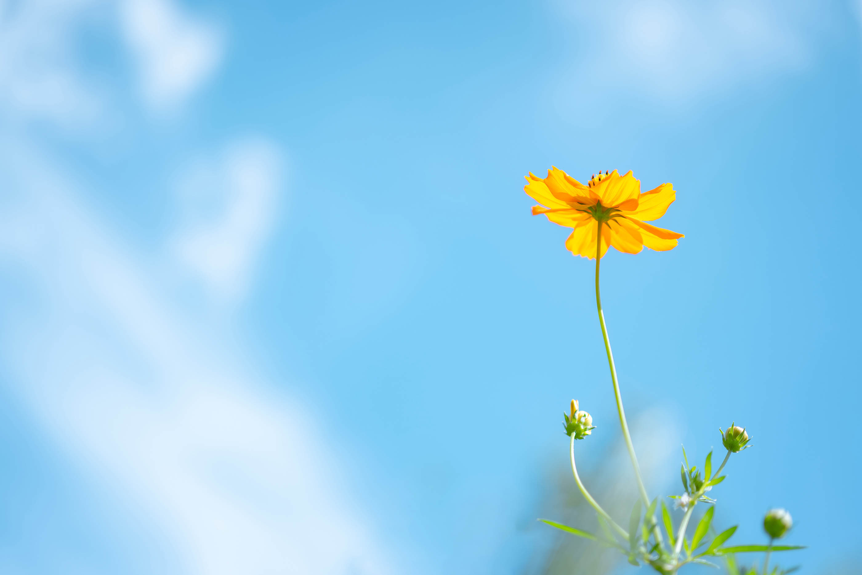 爽やかに晴れた日の午前中、自宅付近の公園にて。コスモスが空に向かって伸びる様子をローアングルであおった。最短撮影距離が短いと地面に咲く花よりも低い位置から撮影できるので、花が見ている景色に近いイメージで撮影できる。