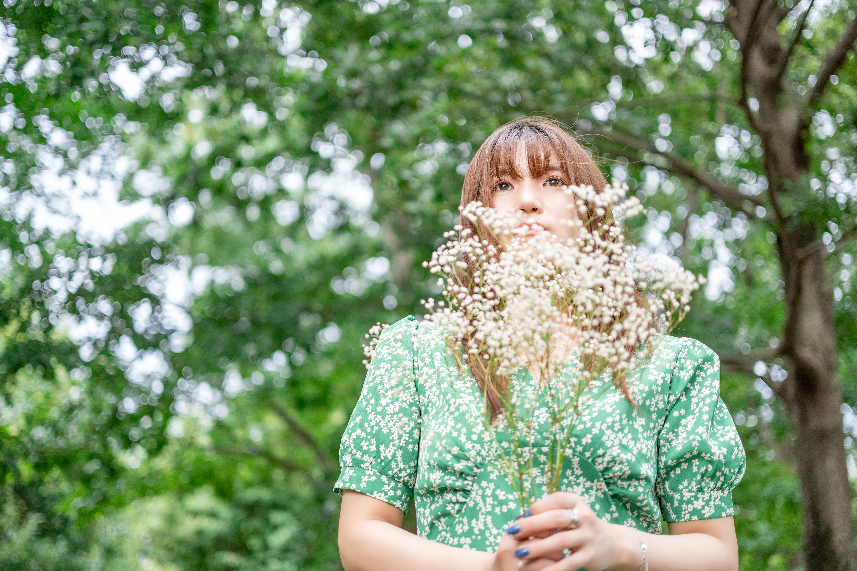 明るいこのレンズはポートレートにも最適。背景に玉ボケの木もれ日が入るように、ウエストレベルでややあおり気味にして構図を整えた。背景と手に持ってもらったカスミソウがふわりとぼけて柔らかい空気感をまとった。