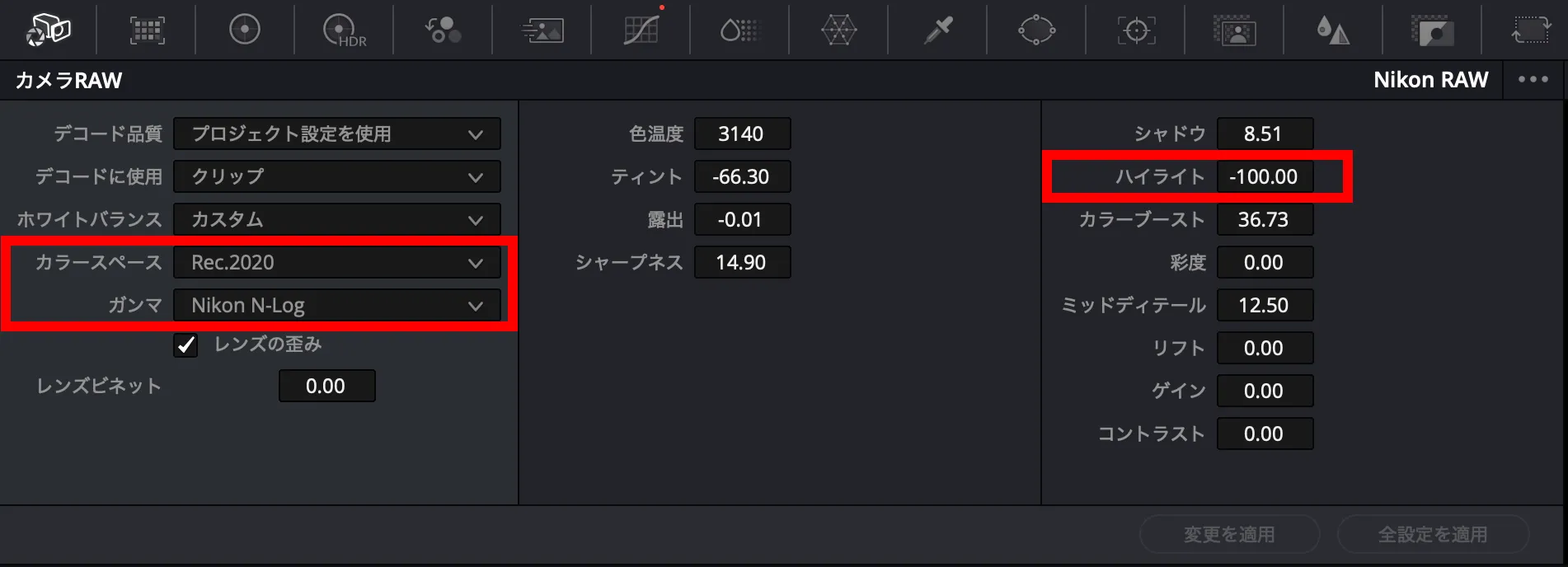 | ISO | F値 | フレームレート | N-RAW設定 | |