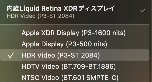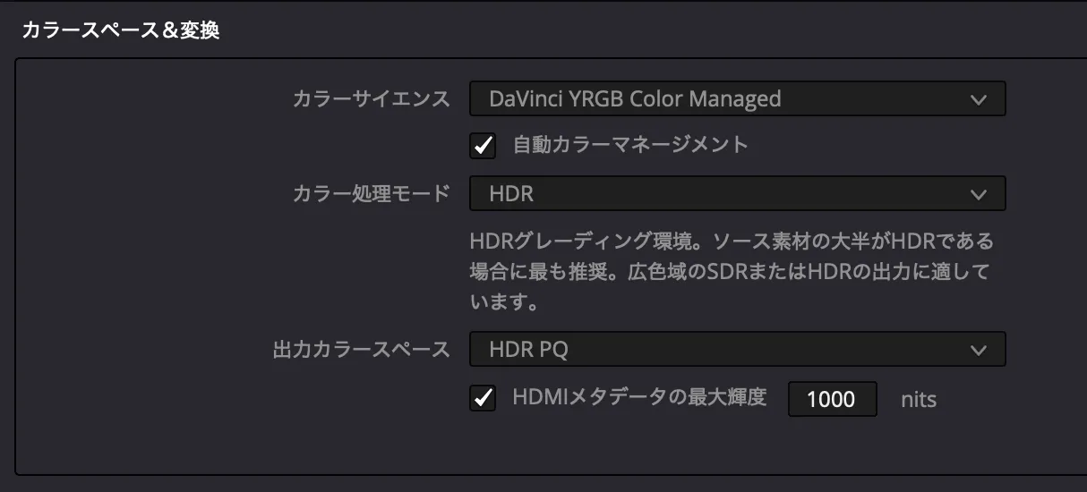 「自動カラーマネージメント」を使い、「カラー処理モード」をHDR、「出力カラースペース」を「HDR PQ」に設定します。プレビューモニターは、前述のASUSのPA32UCRのように最大輝度が1000nit以上出るものが望ましいでしょう。HDRモードに切り替えて作業します。MacBook ProのXDRディスプレイを使う場合は、「HDR Video (P3-ST2084)」に設定します。