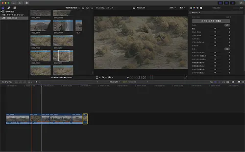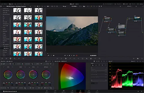 Log3G10で撮影した映像はそのままでは視聴することができません(同時に記録されるプロキシー動画をプレビューすることで撮影した内容は確認できます)。 Log撮影の映像はコントラストが浅く、一般的なモニターではとても淡い見た目になるためです。そのため、編集時に適切なカラーマネージメントとLUTを適用し、最終的に視聴できる色へ変換する作業が必要になります。R3D NEファイルは代表的な編集ソフトで扱うことができます。