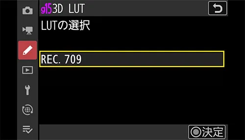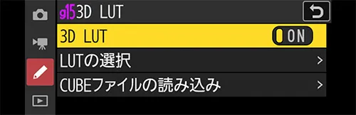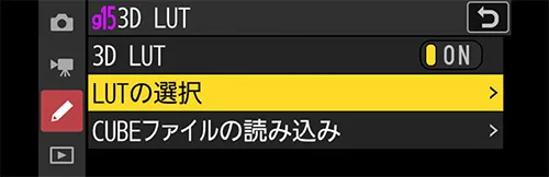 R3D NEを選択すると、Log3G10ガンマとREDWideGamutRGB色域に固定されますので、通常のモニターで見ると色やコントラストの浅い映像に見えます(HDMIから出力される映像も同様です)。その状態ではモニタリングがしにくいので、3D LUTを当てて色やコントラストをつけ、フォーカス操作や露出制御をしやすくします。3D LUTはデフォルトでZRに1つ入っているので、まずはそれを使用してみましょう。