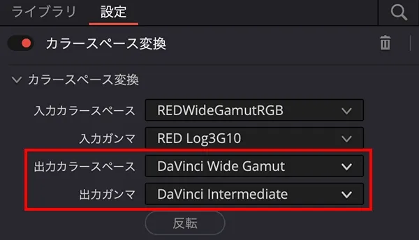 一方、DaVinci Resolveのワークフローで最近主流となっているのが、「Color Space Transform」(カラースペース変換)というエフェクトを使った方法です。この方法は、入力色空間、出力色空間をそれぞれ設定し、DaVinci Resolveの広い色空間の中で処理をすることで、撮影素材のもつ階調を最大限活かした色調整ができるため、ここ数年その普及が進んでいます。