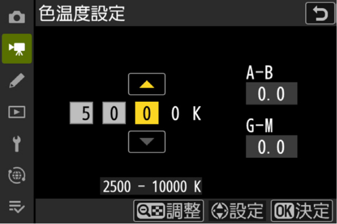 ホワイトバランスを[プリセットマニュアル]で設定する際、基準となるプリセットマニュアルデータを、これまでより狭い、画像表示全体の約0.5%の面積※で取得できます。ほんの狭い範囲の白またはグレーの部分を捉えてデータを取得できるので、スムーズに正確なホワイトバランスを設定できます。また、[色温度設定]を選んでいるときにも、選択中のケルビン値を基準にA(アンバー)、B(ブルー)、G(グリーン)、M(マゼンタ)の4方向で調整が可能に。他のホワイトバランス項目と統一された操作性で、より容易に調整できます。
