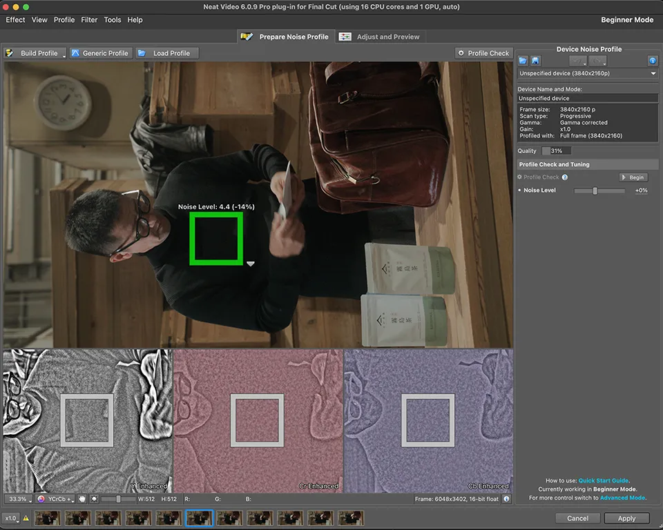 今村茶園の映像では、あえてレトロ感を出すためノイズを残すことも多いのですが、今回は車両の「ビカビカ感」「ツルツル感」を強調したかったため、特に夜間や室内で照明条件が厳しいカットを中心にNeat Video v6を使用してノイズ除去を行なっています。