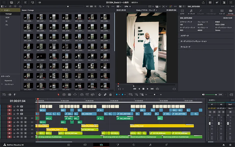 ふだんはPremiereを使っているのですが、今回は素材がR3D NEということで、より親和性の高いDaVinci Resolveに挑戦しました。もともとDaVinciを導入しようと思っていたので、よいきっかけになりました。いつも表現しているような色味に近づけるグレーディングはできる状況になりました。