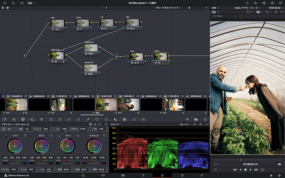 映像制作会社KAGEでは、作品に合わせてより重厚なルックで仕上げることも多いのですが、Oasisシリーズはそれとも違った独特なルックになっています。LUTを2つ適用して世界観を再現しています。