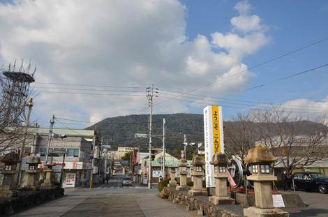 駅前から参道へ続く道、右奥が象頭山