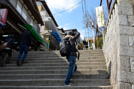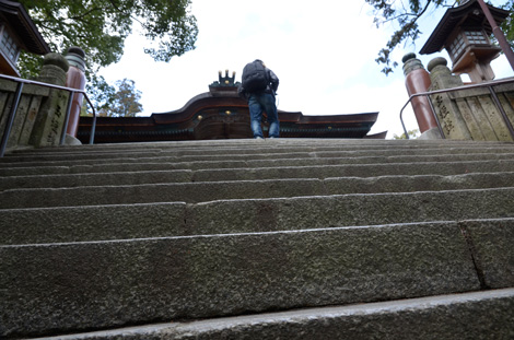 石段を登りながら撮影し続ける藤村先生