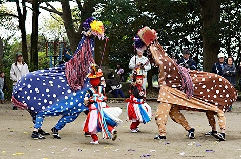 全部で十個ある大きな鉦を叩き神社へ向かう