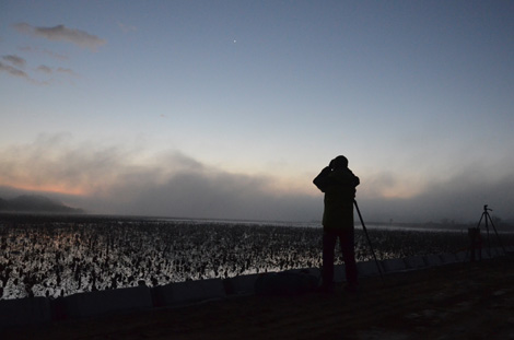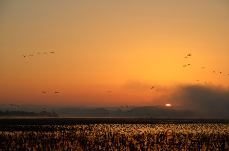 日の出の瞬間 小さな群れがいくつか飛び立っている