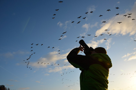 頭上を飛び越し、散開した群れが飛び去る瞬間も