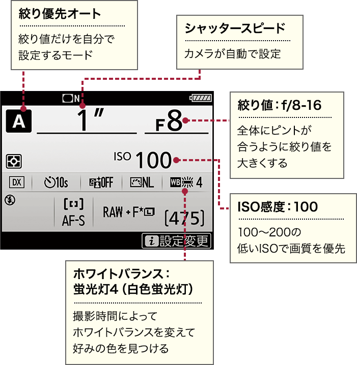 装着レンズによって絞り値の設定を変えよう。単焦点レンズ f/8-10 ズームレンズ f/10以上