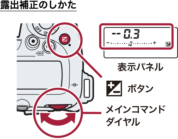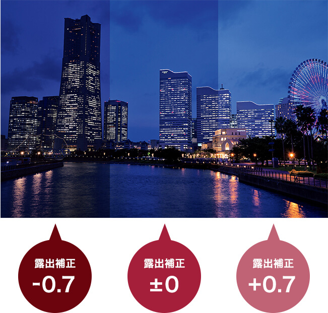 露出補正をマイナス側にすると暗くなり、プラス側にすると明るくなります。