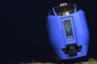 ■ 北の大地を最高時速120kmで駆け抜けるキハ281系「スーパー北斗」。振り子装置を使い、カーブで車体を傾けながら高速で走る姿は「北の俊足ランナー」の二つ名にふさわしい豪快さを感じる。■ 撮影地は函館本線礼文駅近くのトンネル出口を選んだ。すぐ横の道道608号線から気軽に撮れる有名ポイントだ。通常は望遠レンズを使ってトンネルポータルを入れた説明的な写真を撮ることが多いが、今回は超望遠でトンネルの暗闇から浮かび上がる「スーパー北斗」をイメージ的に狙うことにした。気をつけることはフレーミングの正確さ。非電化区間のためトンネルの高さが意外と低く、いい加減にフレーミングしてしまうとトンネルポータルが画面の隅に入ったり、逆に望遠にしすぎてしまうと「スーパー北斗」の運転台まで切れたりしてしまう。実は針の穴に糸を通すような繊細なフレーミングが要求されるのだ。シャッター時のミラーショックでさえ失敗に繋がりかねない。だからこそ望遠域で絶妙な焦点距離を選ぶことができ、4.5段分※の手ブレ補正効果が得られるAF-S NIKKOR 200-500mm f/5.6E ED VRはベストレンズである。■ 撮影までのまったりとした時間を楽しんでいると、やがてトンネルの奥からエンジン音が響いてきた。ヘッドライトが見えると、あっという間に「スーパー北斗」がトンネルから顔をのぞかせる。すかさずその瞬間をシュート。緊張の一瞬だったが仕上がった作品は最高の出来栄え。このドキドキ感と撮れた時の嬉しさがあるから鉄道写真はやめられない。