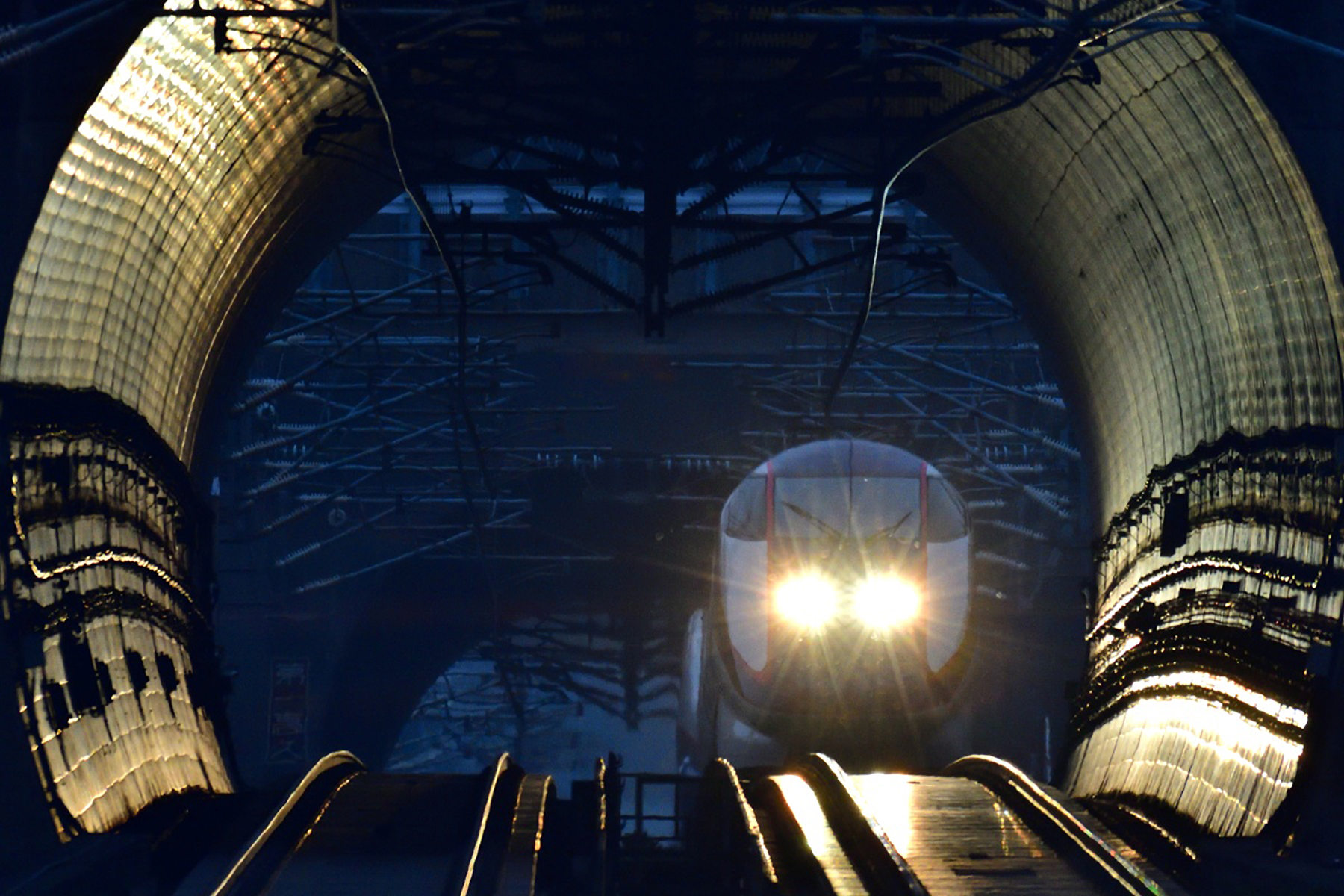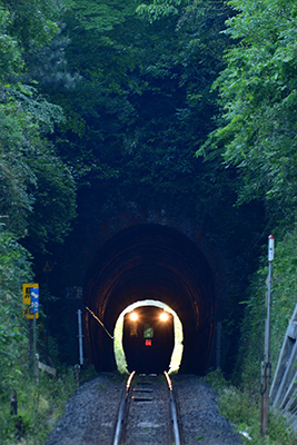 ■ トンネルに突入した山陰本線の特急「スーパーまつかぜ」のイメージカット。トンネル入口の明るい部分を額縁に仕立てて車両をシルエットで表現した。トンネル出口側の風景も入れることで空間に奥行きを出した。