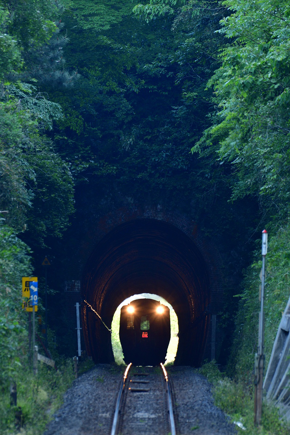 ■ 有名撮影地で撮影していると、同じ場所でも定番とは違った撮影をしてみたくなるのはよくあること。この場所も東北新幹線の那須塩原~新白河の間にある有名な撮影地で、迫りくる新幹線を望遠レンズで狙う人の姿をよく見る。トンネルを出たところで編成写真を撮るというのがお決まりの構図だ。私は、そのトンネルの奥まで入れた印象的な写真が撮りたかった。そこで、AF-S NIKKOR 200-500mm f/5.6E ED VRにAF-S TELECONVERTER TC-20E Ⅲを装着。さらにDXフォーマットのD500の1.3倍のクロップ機能を使用し、35㎜換算で約2000mm相当の画角の超々望遠で挑んでみた。日没後の青い時間、E3系「つばさ」が丘を越えるように姿を見せると、ヘッドライトによってトンネルの壁面が黄金色に浮かび上がる。その美しさを目の当たりにして、無心になってシャッターを押し続けた。