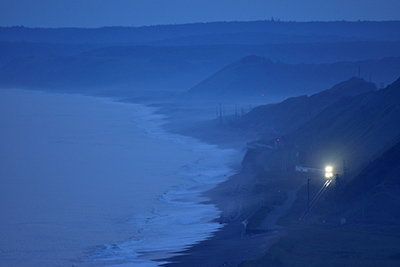 ■ 根室本線の音別~古瀬は海岸線を走る鉄道絶景ポイントだ。その海岸線を狙う場所は線路から2km以上も離れた丘の上。超望遠撮影をすることで、うねるような海岸線をダイナミックに写すことができる。北の海は夏でも冷たく、海風に乗って霧が浜辺に漂うことがあるが、この時も海霧が絶景に華を添えてくれた。夕暮れ時にも美しいシーンが撮れたが、日の入り時刻の20分後に特急「スーパーおおぞら」が来るというので欲を出して粘ることにした。青い霧が漂う幻想的な世界に、遠く霞む「スーパーおおぞら」のヘッドライトが見えた。徐々に近づく海岸線をなぞる光芒が一瞬レールに輝きを与える。大自然の中、人間の生み出した光の力強さに感動を覚えた瞬間だった。