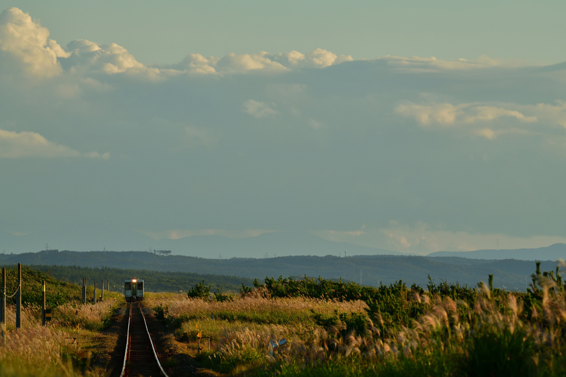 ■ 鉄道写真愛好家なら誰にでもお気に入りの撮影地や路線というものがあるだろう。人から「好きな路線は?」と聞かれると私は決まって「大湊線」と答える。大湊線は青森県の下北半島を北上する全長約58kmのローカル線だ。その中でも特にお気に入りの撮影地は有戸駅から吹越駅の陸奥湾沿いの区間である。まるで北海道を思わせるような雄大な海辺の景色は、日の出前から夜に至るまで様々な表情を見せ、いつ行っても飽きることがない。 ■ 9月初旬、残暑という夏の残り香が漂うこの日も大湊線の雄大な景色を求めて訪れたわけだが、このとき目を奪われたのは平原の風景だった。超望遠の圧縮効果を使って夕陽に輝くススキを重ね合わせ、海の景色とは異なる雄大な風景を撮りたくなったのだ。 ■ すこしひんやりとした海風に頭を撫でられサワサワと揺れるススキの音がとても心地よい。はるか八甲田の山々の上には夏雲が漂い、夏から秋へと変わる微妙な季節感にも写欲が湧いてくる。 ■ 列車を待つこと20分、2km程先のカーブを曲がってくるキハ100系のヘッドライトが視界に入った。ひたすらまっすぐ向かってくるキハ100系をD850のコンティニュアスAFサーボ(AF-C)を使いながら、ゆっくりとシャッターを押してゆく。向かってくる列車を撮るときには緊張感が否が応でも出てくるものだが、このときは妙に静かな気持ちで撮ることができた。景色に心を奪われていたからか、それとも風に揺れるススキの音が心地よかったからだろうか、それは今となっては知る由もない。