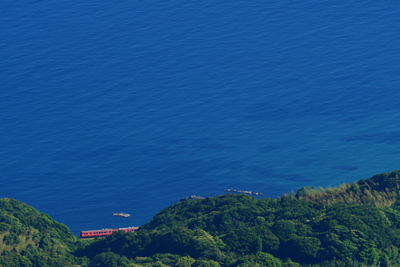 ■ 秋田が実家の私にとって、日本海はやや緑がった色をした荒々しい海のイメージがある。しかし同じ日本海でありながら、山陰地方のそれは南国のように青く澄んだ色を湛え、穏やかな表情を見せるので、訪れるたびに驚いてしまう。その海際をなぞるように走る山陰本線。全長約675kmを誇る長大路線の沿線には数多くの鉄道絶景撮影ポイントが存在するが、特に島根県から山口県の海辺の風景はどこも美しくおすすめだ。 ■ 海の風景を撮りたいと思うと、つい海に近づきがちだが、この作品の撮影場所は海からなんと1.5kmも離れた浜田市の大麻山山頂展望台だ。大麻山は標高が599mあり、山頂からさらに15mの高さに組み上げられた展望台から望む日本海の景色はまさに「絶景かな絶景かな」である。訪れた5月下旬は気温の高い日が続き見晴らしが心配だったが、この日の私は運が良く、抜けの良い好天の朝に恵まれた。7時過ぎに展望台前に到着、いそいそと撮影の仕度を始めた。この展望台は鉄骨組みの丈夫な外観の割には、私が一歩でも動こうものなら大きくゆっくりと揺れる。特にAF-S NIKKOR 200-500mm f/5.6E ED VRでの望遠撮影となるとその揺れが顕著に出る。とにかく動かないよう細心の注意で列車を待った。7時52分に遠く周布を出た2両編成のキハ47形を確認すると、海際の小山に隠れた列車が顔を出すまで微動だにせず、なるべく呼吸もしないことにした。紺碧の海に鮮やかな朱色のキハ47形が見えて、シャッターを押すまでの間の苦しかったことと言ったら……。