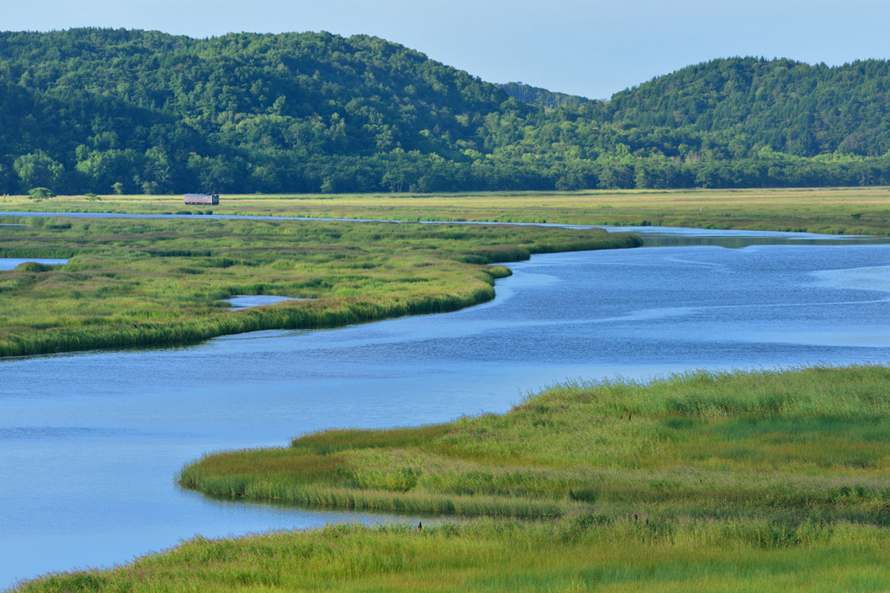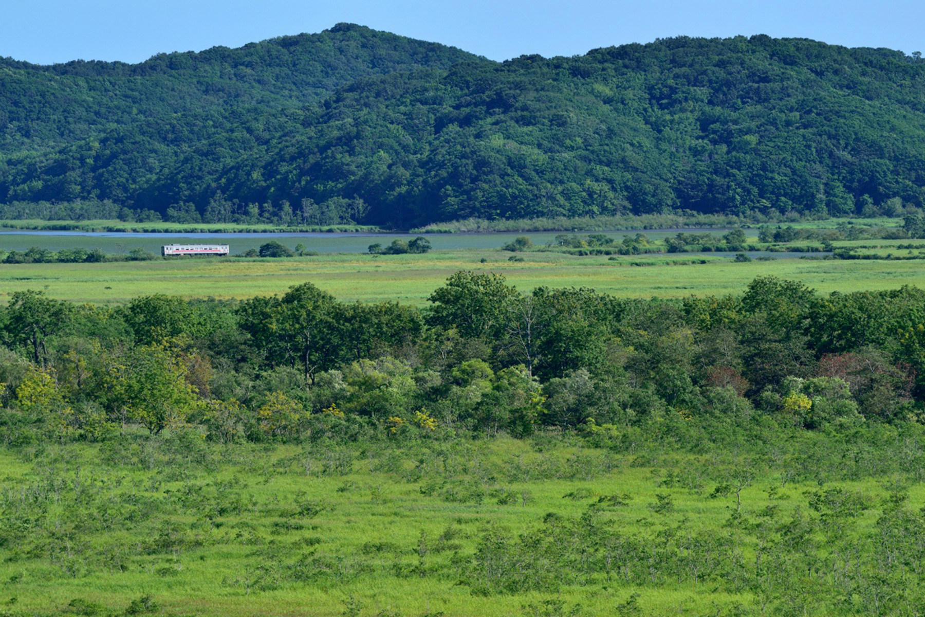 ■ 幼い頃に旅番組やテレビドラマで見た北海道の景色はまるで異国のように美しく雄大で、当時の私はブラウン管越しに見る北の大地に憧れを抱いたものだ。その思いは大人となった今でも変わらない。特に釧網本線や根室本線のある道東の風景は初めて訪れたときから私の心を震わせた。大自然の風景とそれと共に活きる人々の営み。ファンタジーの世界をも連想させる空気感で私を迎えてくれたのだ。そこでは鉄道もまるで大自然に敬意を払って走っているかのようだ。 ■ 夏の終わりに釧路湿原のコッタロ展望台を訪れた。夏の雨の多い季節には湿原のあちらこちらに沼地も見えるようだが、この時期は草原と化している。その草原を1両のみのキハ54形がトコトコとやってきた。午後の日差しに照らされて柔らかく車体が光る。 ■ やがて緑あふれるこの風景も秋を迎えると褐色の草原へと変わるだろう。過ぎ去る列車にその美しい光景を想像で重ね合わせながら「秋にまた来よう」と思い幾月。その思いはまだ遂げられずにいる。