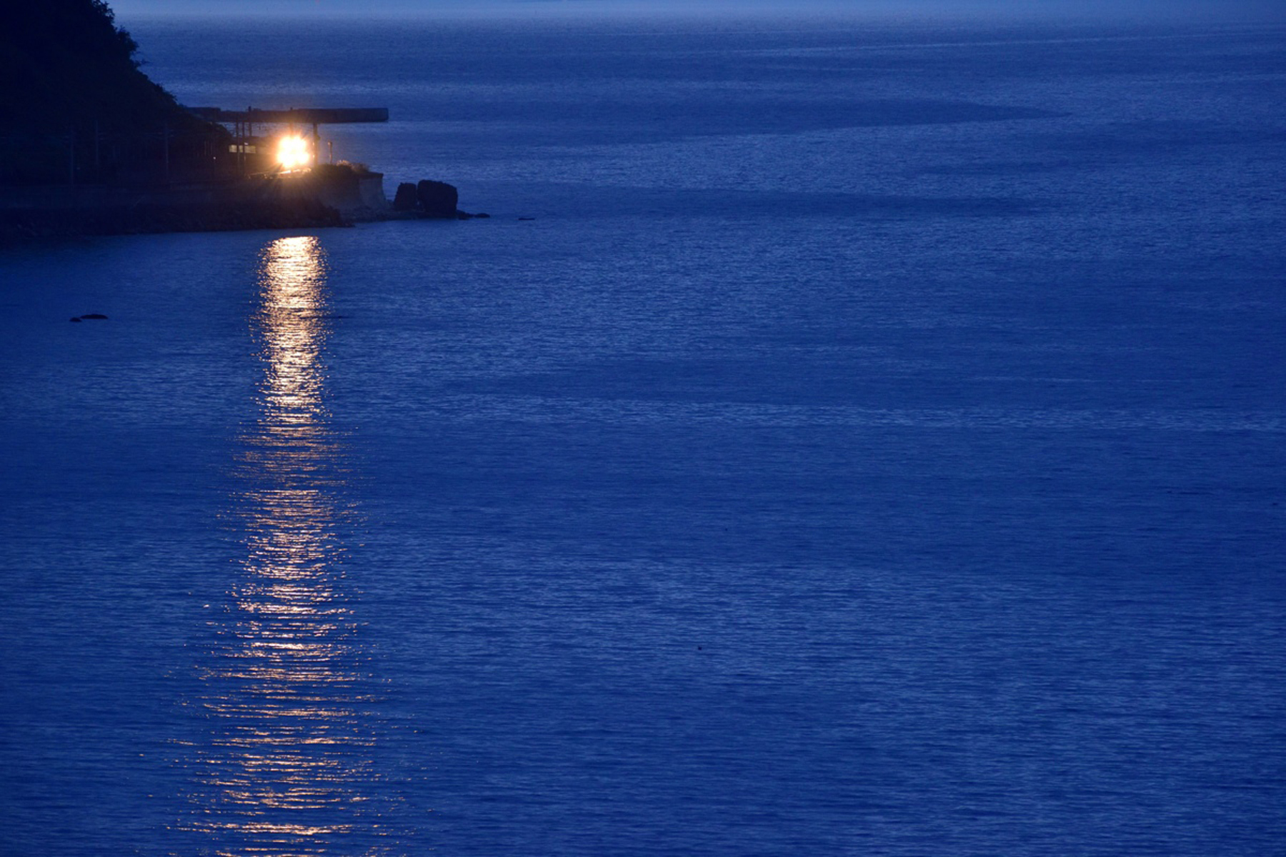 ■ この日の朝は函館本線の森駅付近の海際から撮影を開始。そのまま函館本線に沿って羊蹄山を眺めながらニセコを経由、ウヰスキーで有名な余市を抜けて小樽に至った。そして最後の締めとして撮りたかったのがこの青い時間帯の景色、ヘッドライトの灯りを印象的にとらえた鉄道イメージ写真だ。場所は朝里駅と銭函駅の石狩湾沿いの区間で、小高い住宅街の道路にある。 ■ 当日の日の入り時刻は18時15分。西の方角に向けて機材をセットするので青みが丁度良くなる時間はその約20分後だ。時刻表を眺めるとその時間に列車がやってくる。まさにベストタイミング。背景には遠く小樽の街灯りを入れることもできるが、少し散漫に感じてしまうので、青みの深くなった海とその海にこぼれるヘッドライトの光芒を中心に狙うアングルにした。時刻通り海際のカーブを列車がやってきた。列車が正面を向くとヘッドライトが強く光り輝く。その瞬間、水面には美しい光の道が伸びていた。