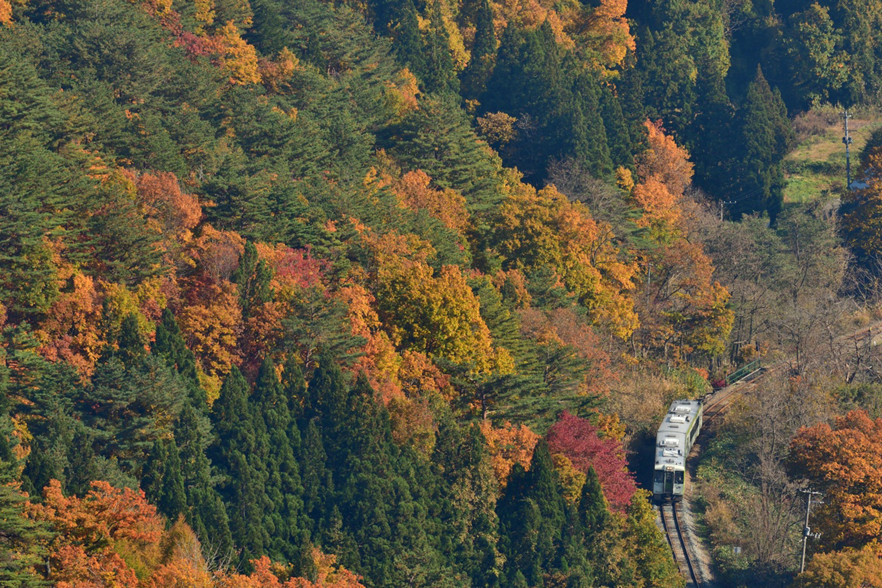 ■ 近年、鉄道撮影地が減っているという声が聞こえてくる。それには有名撮影地も例外ではない。 ■ この作品の撮影場所は米坂線の手ノ子駅と羽前沼沢駅の間の宇津峠にある。そばに電波塔があるので通称「宇津峠電波塔俯瞰」とも呼ばれ、米坂線の美しい風景を求めて多くの鉄道写真愛好家で新緑や紅葉の季節を中心ににぎわっていた。だが私が訪れたとき、有名なお立ち台は木が生い茂り俯瞰することもままならない状況だった。運よく電波塔から少し下がった近くの尾根から展望できる場所があり、一台は標準レンズで大風景を、もう一台はAF-S NIKKOR 200-500mm f/5.6E ED VRでクローズアップして撮ることができたが、この場所が使えなくなるのも時間の問題だろう。 ■ 撮影中に出会った地元の人の話では、ここ最近米坂線を訪れる鉄道写真愛好家の姿が少なくなったという。撮影地が少なくなるから訪れる人が減るのか、人が減ったから撮影地が消えていくのか。どちらにせよ、今この瞬間を記録として刻むことが何より大切と感じたときだった。