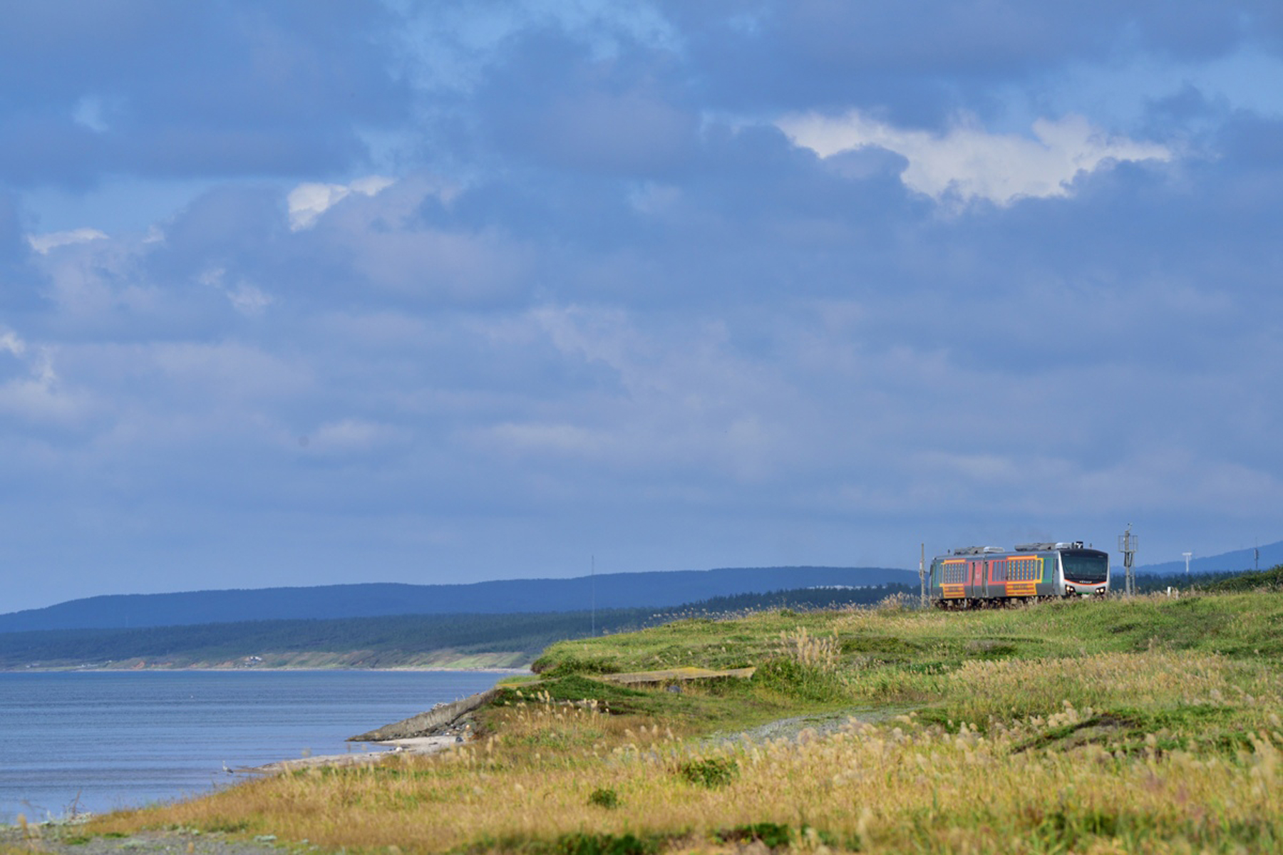 ■ 大湊線の有戸駅と吹越駅の陸奥湾沿いの区間は、超広角レンズから超望遠レンズまで使った様々な撮影ができるほど懐が深い。海際の鉄道風景写真となると、とかく広角レンズや標準レンズに頼りがちだが、この作品は空と海と大地の雄大さ、そして列車を望遠レンズ特有の圧縮感で表現してみた。この風景を活かすにはもともと存在感の強い列車が大きくなってはならないので、とにかく線路から離れた。600m程離れただろうか。海と大地がバランス良く見える理想の場所が見つかった。空の表情も良く、望遠でありながら雄大さを感じる。 ■ ちょうど良い頃合いで観光列車「リゾートあすなろ」がやってきた。車内では多くの観光客が海際の車窓を楽しんでいることだろう。そう思うとカラフルな列車がより楽し気な雰囲気に感じられた。