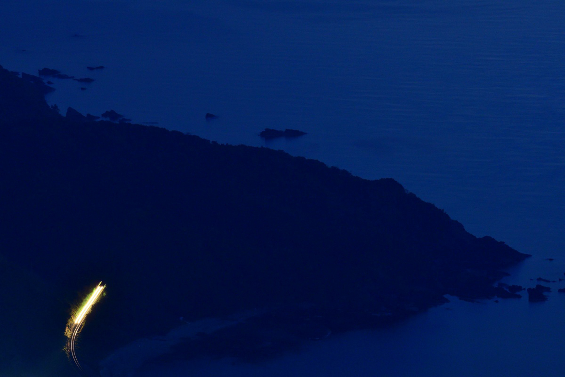 ■ 大自然の前には人間の存在などちっぽけなものではあるが、大自然の中においても存在感を大きく放つものがある。人間の生み出した光だ。漆黒の闇の中にあって力強く輝く光はまさに人の営みの象徴である。鉄道が放つ光も鉄道写真ではフォトジェニックな被写体であり、その温かさと安堵感はファインダー越しにも味わうことができる。 ■ この作品は実は「山陰本線 周布~折居」の作品と同じ大麻山山頂展望台から撮影したものだ。日の入り後にわずかばかりの青みが残る海際の山陰本線。その青みも闇に吸い込まれるかのようにみるみる深くなる。私のいる大麻山山頂では虫の声に紛れて鹿の鳴き声も聞こえてきた。時間の経過とともに闇への不安感が募ってくる。そんな中、トンネルを出た列車のヘッドライトが二条のレールを照らし出した。はやる気持ちを抑え、的確に一度だけシャッターを切る。2㎞以上離れた遠くの小さな明かりをこれほど力強く、また頼もしく感じたことは今までなかった。