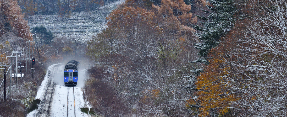 ■ 2016年11月上旬、東日本には季節外れの寒波が襲来した。そのとき、たまたま私は北海道へと撮影に出たばかりで、着岸間際のフェリーの窓から見る夜も明けぬ函館の街灯りが横殴りの雪に霞んでいたことを覚えている。目的地の岩見沢駅に向かって国道37号線をひたすら東進。やがて長万部町と豊浦町の境である礼文華峠にさしかかったとき、まだ落葉しきっていないカラマツと杉の林がうっすらと雪化粧をしている美しい光景が目に留まった。時刻表を確認すると「北斗」が間もなくやってくる。すかさず近くの撮影地へと車を走らせた。雪はまだ軽く積もったばかりのようで撮影地までいともたやすくアプローチできたことが幸いだった。 ■ D500にAF-S NIKKOR 200-500mm f/5.6E ED VRをセットし、「北斗」が来るまで張り詰めた冬の空気と撮影前の緊張感、そして目の前の美しい風景をじっくりと味わう。カラマツの赤茶色の葉が白雪に映えて実に鮮やかだ。季節の狭間に起きた天のいたずらに心が踊る。やがて遠く踏切の警報音が鳴り、キハ183系「北斗」が汽笛と共に雪煙を巻き上げながら姿を現した。 ■ 撮影後、手ごたえに満足しながら機材をバッグに片付けていると、強い海風に乗って荒ぶる海鳴りが聞こえてきた。「そうだ。これから厳しい冬が始まるんだ」そう思うとそれまで見ていた景色が寂しくはかなげに思えて仕方がなかった。