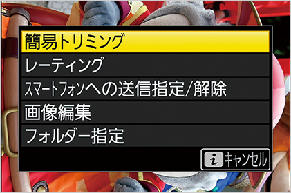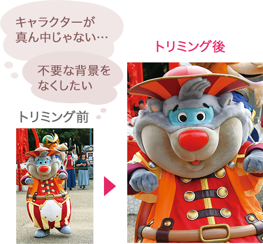 カメラの[簡易トリミング]を使えば、誰でも簡単にトリミングできるので、パレードやアトラクションの待ち時間などを有効に活用できます。
