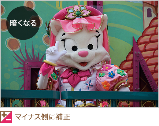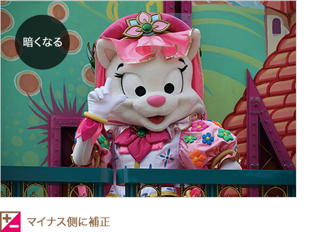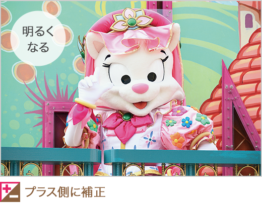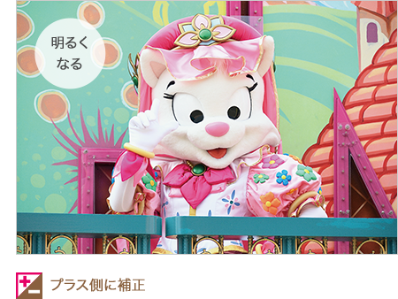 特に白い顔のキャラクターは日差しが強いと真っ白になることも。そんなときは「露出補正」で少し暗めにして撮影してみましょう。