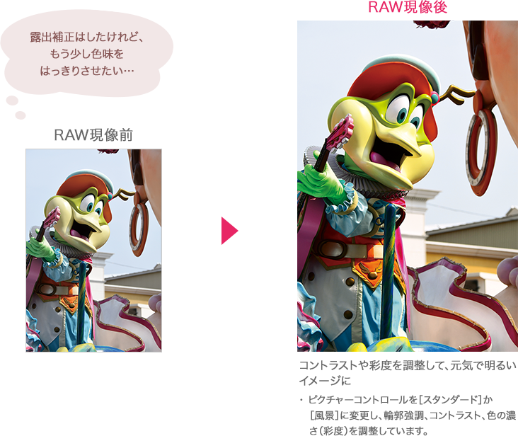 撮影後に自分好みの表現に仕上げたいならRAW現像。画質モード[RAW+JPEG]で撮影し、後からD7500のカメラ内RAW現像で簡単に撮影画像を調整できます。
