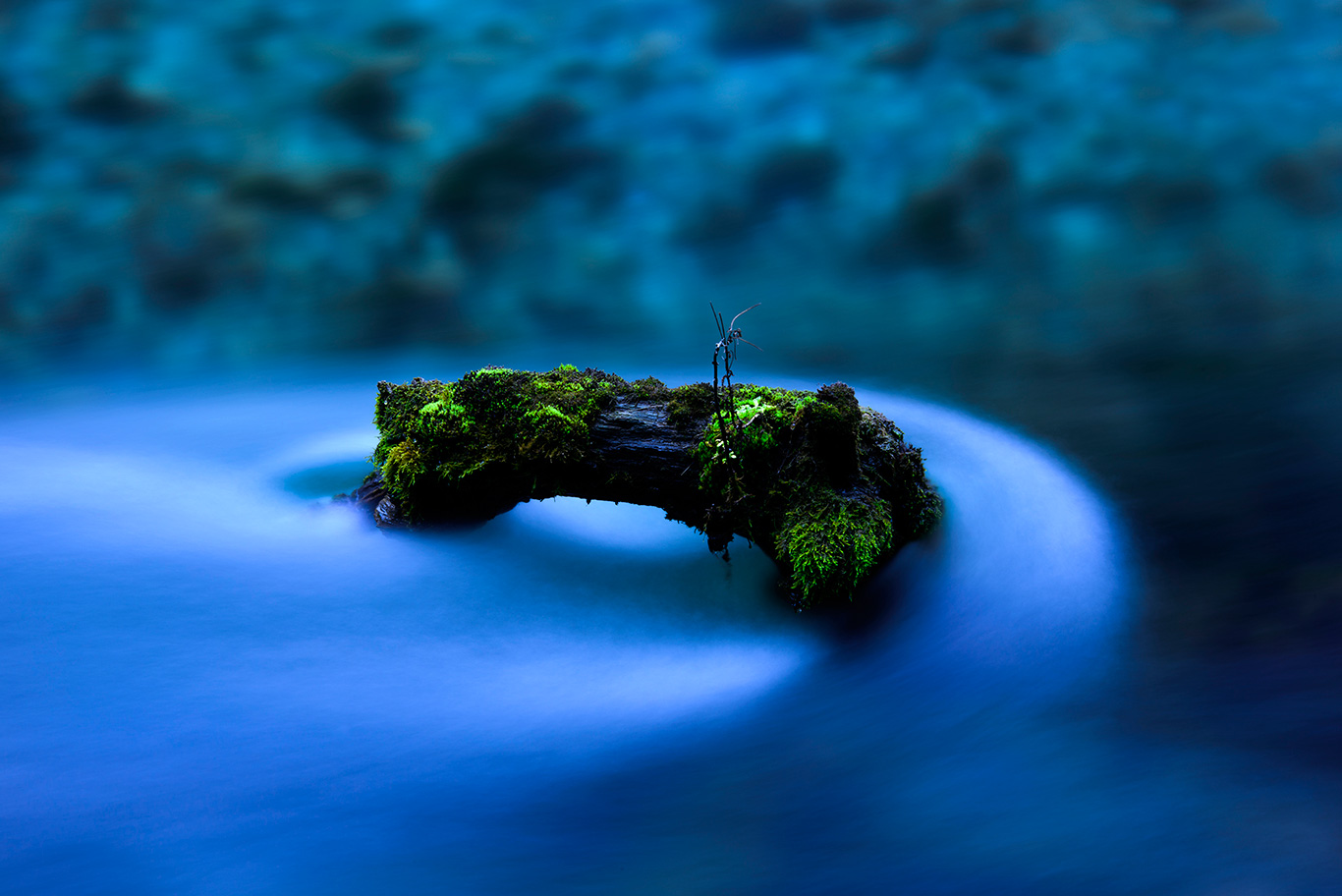 きれいに苔むした木片が流れの中で留まっていた。悠久の時間の中でそこだけ時間が止まったような、別の時間が流れているかのような不思議な木片だった。流れ行く時間の中で、ある場所に定住して暮らすちっぽけな自分のようにも見えてきて不思議だった。