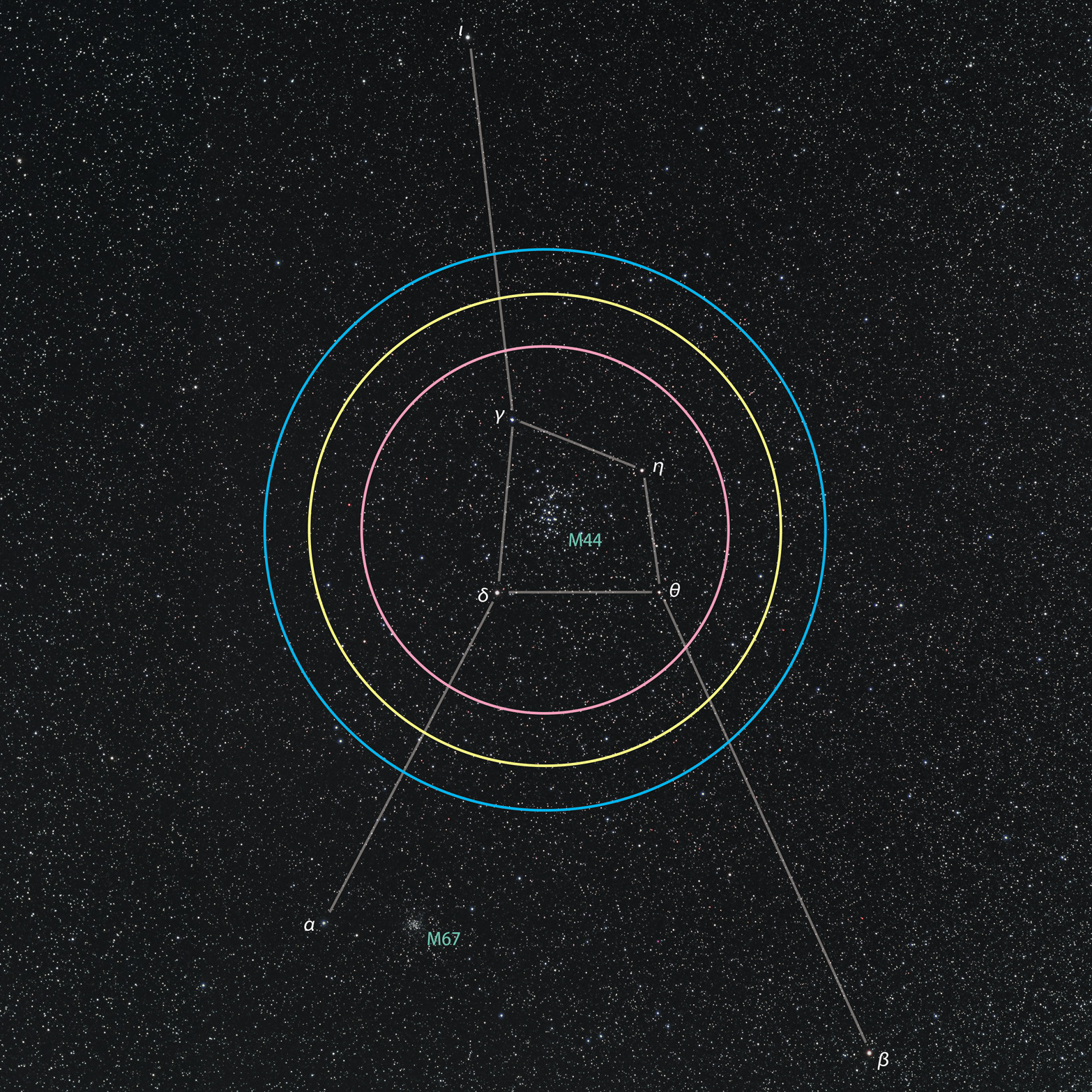 かに座の甲羅にあたる所に、ぼやっとした光茫があります。西洋では「ビーハイブ(蜂の巣)」と呼ばれ、中国では死んだ人の魂が天に昇る場所だと考えられていました。この光茫の正体は500個以上の星が集まった散開星団M44(プレセペ星団)です。肉眼でもいくつかの星が見えますが、双眼鏡では100個以上の星を数えることができます。カニの甲羅のγ、δ、η、θ星からなる四角形は4.5度ほどの大きさなので、一般的な7×50mmの双眼鏡の視野では少し窮屈な印象です。その点、視野が広くシャープな星像を結ぶWX双眼鏡なら、M44の星粒を数えながら、かつて「積尸気」や「ビーハイブ」と呼ばれた光茫を眺めることができます。