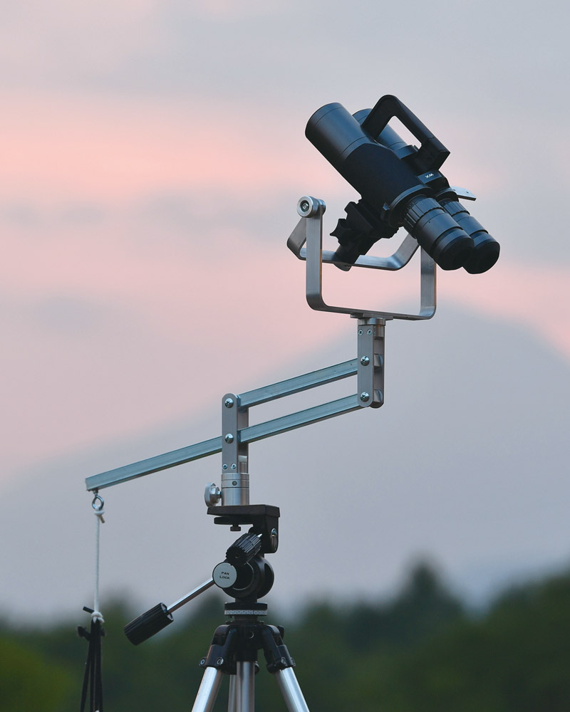 WX 10×50と7×50を同時に持って行くことは稀で、その日の観望対象と他の望遠鏡との組み合わせでどちらを持って行くか選択する。重量バランスが良いのでWX 7×50のときは手持ち観望が多いが、WX 10×50のときは、以前ネットで入手済のシーソー式の双眼鏡用架台を使う。この架台は、カウンターウェイトでバランスが取れるためフリーストップ状態で、手持ちに近い感覚で軽快に星空散歩を楽しめる。