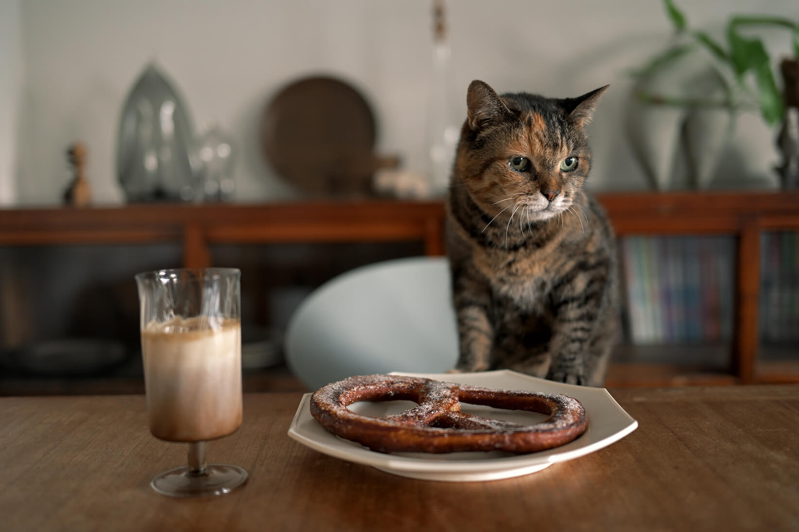 コーヒーの湯気に包まれた猫をイメージした、セピア調のフィルム風レシピ。少し暗めに撮るとノスタルジック感が増し、明るめに撮ればふんわりとしたカフェの雰囲気に。室内のやわらかい光で、猫の落ち着いた時間を残したいときにおすすめです。
