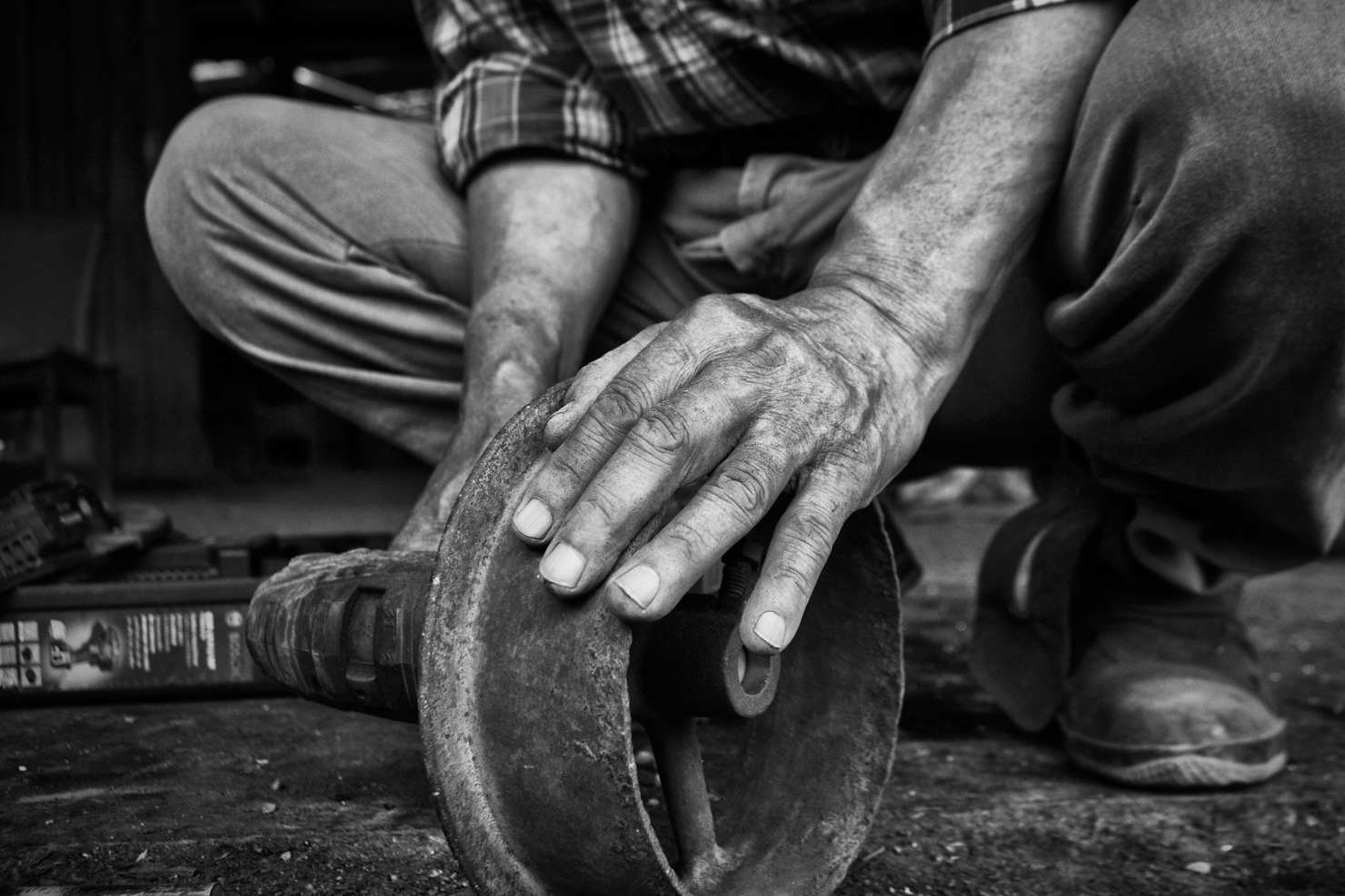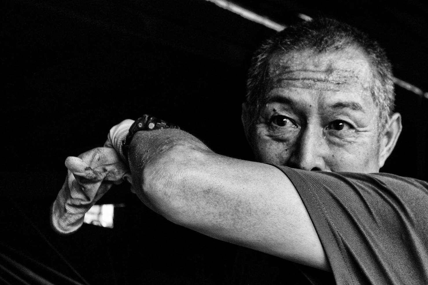「〈働く〉は、モノクロ写真で男性の服のシワや血管まで浮かび上がってくるようです。力仕事に従事して逞しく生きている姿をうまく抽出できています。アングルも見事で、雑多な背景の中でも人物がよく引き立っていますね。気になったのは各写真の露出差。意識して調整すると4枚のまとまりがより出るはずです」(秋山)