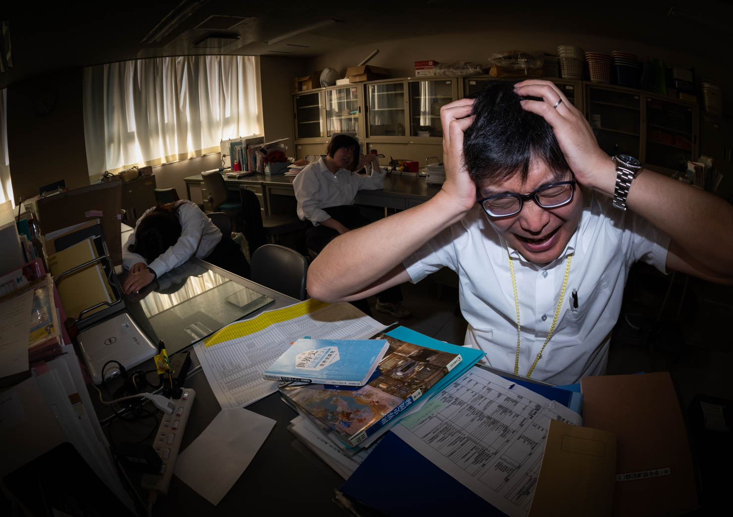 「〈うわぁぁぁぁ〉は、明らかに演技をしていることがわかる、コミカルさが面白いと思いました。頭を抱えている先生と、遊んでいる学生という設定で被写体に指示しながら自分が描いたドラマを一枚に落とし込む工夫がうまく凝らされています。学生は陰の中にいて、先生だけに光が当たっているところもよく、自分自身や誰かを被写体に当てはめてみるなど、見る人によって違う解釈ができる作品だと思います」(秋山)
