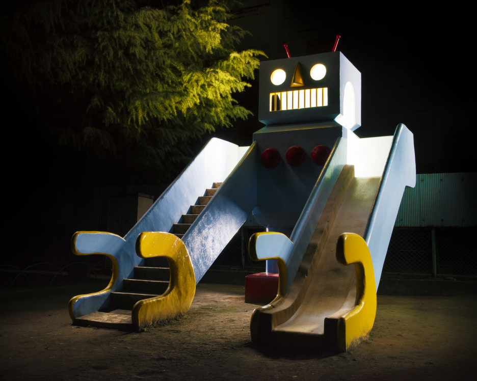 昼間は子供の遊び場として賑わっている公園遊具。日が暮れてから彼らをライティングして撮影をすると、シュールで不思議な遊戯彫刻(プレイスカルプチャー)としての一面を見ることができる。アート作品として趣き高い年月の経った公園遊具は全国に点在しているが、安全性の問題や公園整備よって減少している。私としてはもう一度、魅力的な彼らの存在を再確認してもらいたく全国の公園遊具を撮影している。今回の展示はその一部の全国の遊具たち。(木藤 富士夫)