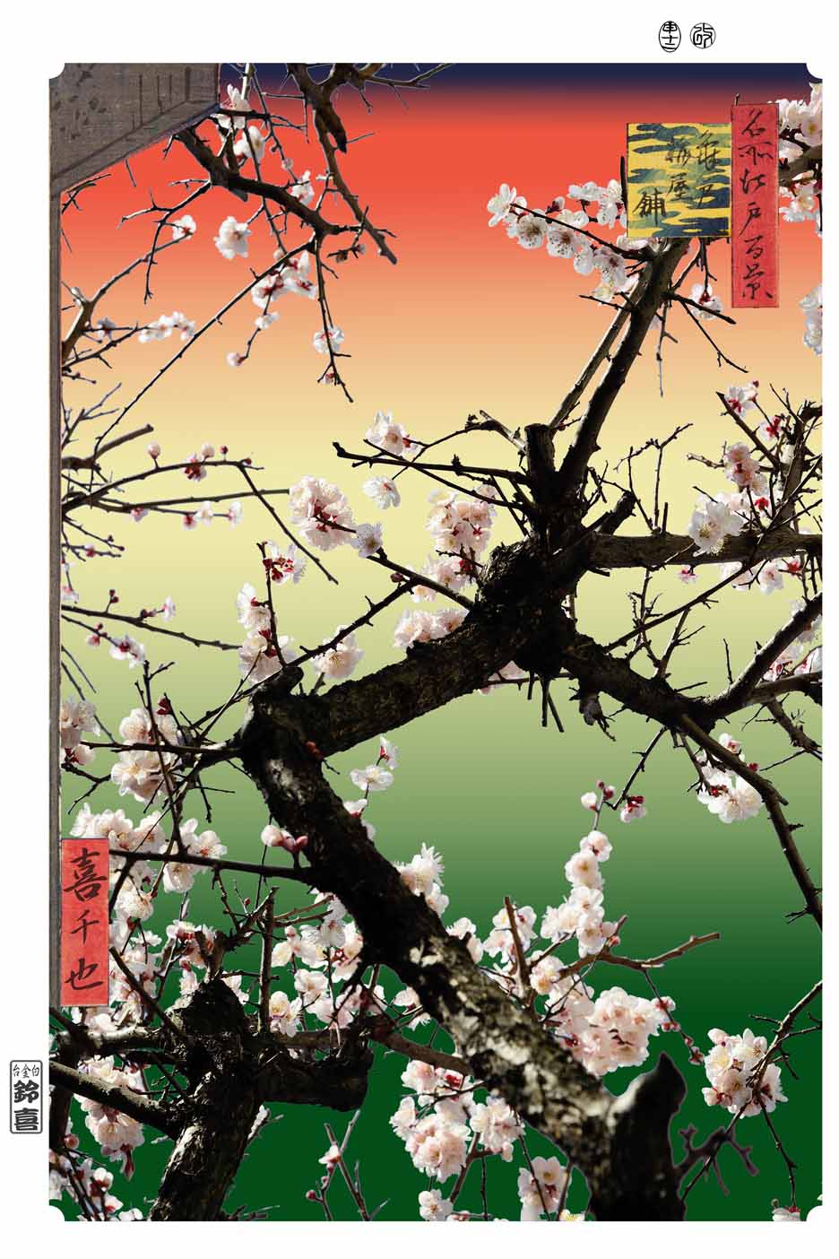 また、作者がファインダーを覗いた時に心で感じた150年前のイメージを再現するために、題箋落款を貼り付け、さらに、元絵の一部をデジタルでコラージュしておりますので、浮世絵ファンならその作品が、どの絵の「NOW !」なのか、一目瞭然でお分かりになると思いますが、すべての方にお楽しみいただけるよう、元の版画も併せてご紹介いたします。