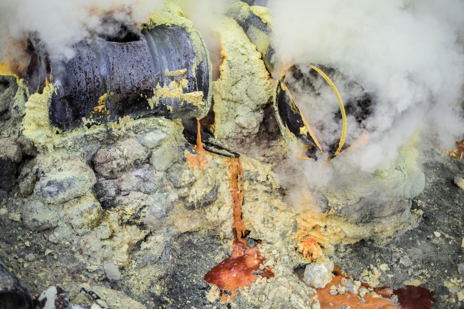 採掘現場はジャワ島東部に位置する活火山「イジェン」。火口では有毒ガスがいたる所で噴出し、高温となった液状の硫黄が足元を流れる。